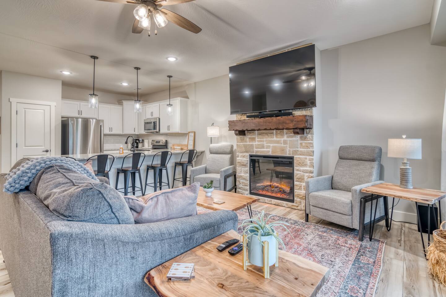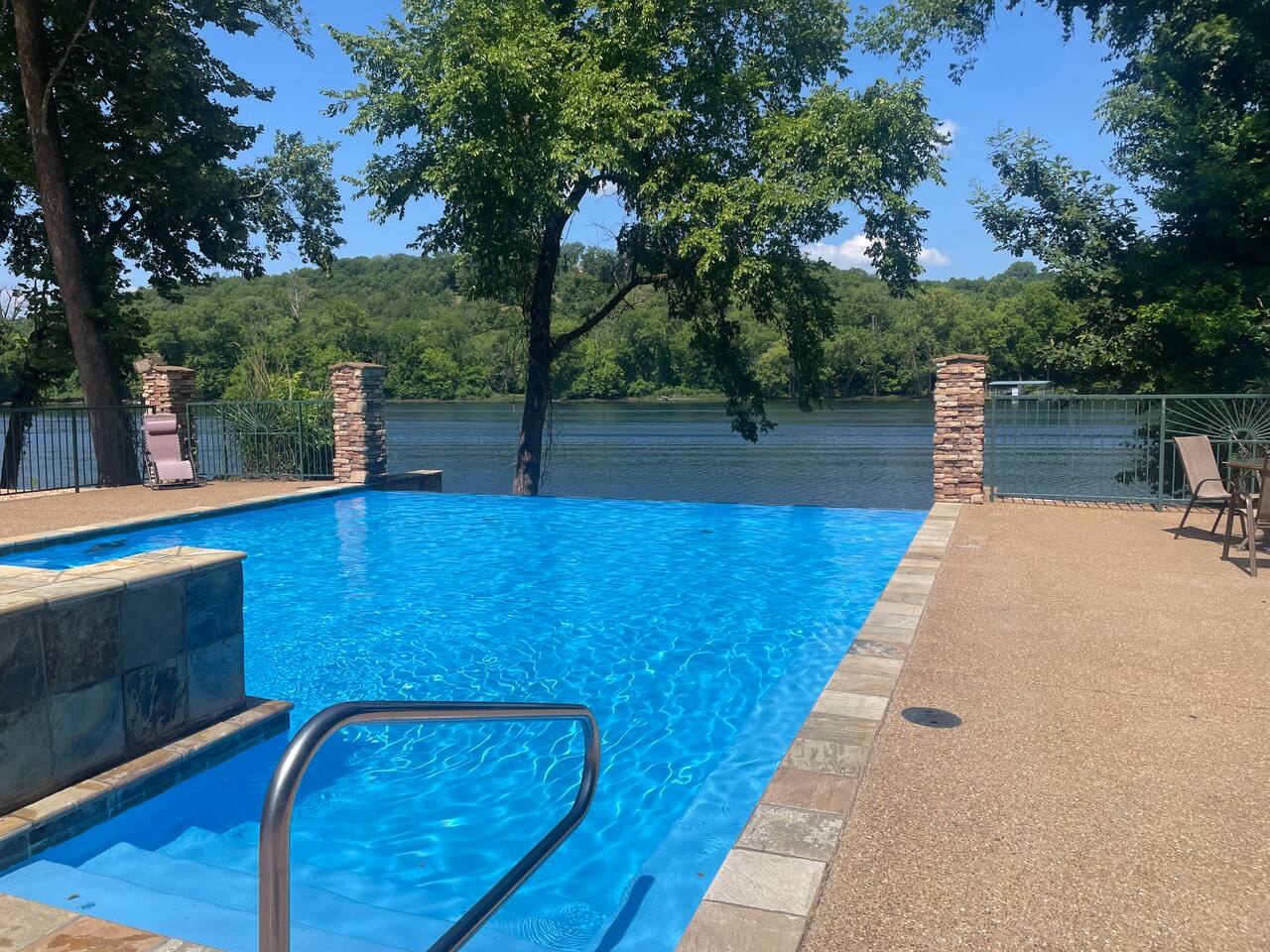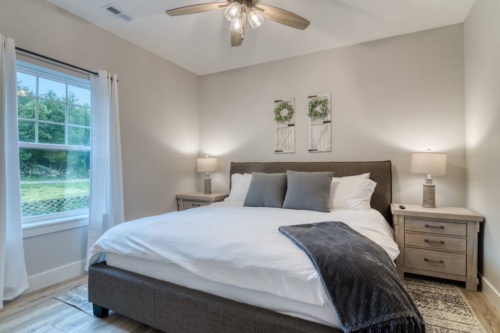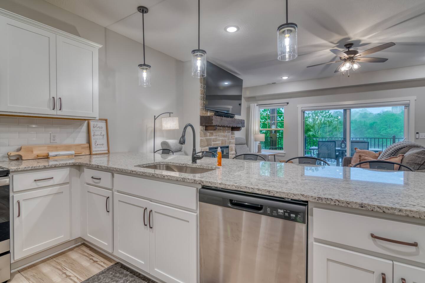Welcome to our BRAND NEW charming waterfront condo, located on the beautiful Lake Taneycomo, just a short drive away from the Branson Landing. Our 3-bedroom, 2-bathroom condo is the perfect retreat for families, couples, or groups of friends looking for a serene getaway. As you step inside, you'll be greeted by a spacious living area that boasts large windows and abundant natural light, offering breathtaking views of the lake. The open layout seamlessly connects the living room to the dining area and kitchen, making it perfect for entertaining guests or spending quality time with family. There's also a large flat screen TV in the living room for your entertainment. Our fully equipped kitchen features modern appliances, granite countertops, and everything you need to prepare delicious meals. The dining area has a six-person table and chairs, perfect for enjoying a meal with loved ones. Or you can step outside and take dinner to the deck, where you can relax, unwind, and watch the stunning sunsets over the lake. Each of our three elegantly appointed bedrooms includes a comfortable king bed, ensuring a restful night's sleep. The bedrooms also feature flat screen TVs, perfect for relaxing after a long day of exploring the area. The two bathrooms have fresh towels ready for you to use during your stay. In addition to the stunning lake views, our condo complex offers a range of amenities, including a swimming pool (hot tub is currently under repair), fire pit, playground, and easy access to Lake Taneycomo. Whether you want to take a dip in the pool, fish from the bank, or rent a boat for some fun on LakeTaneycomo, there's something for everyone to enjoy. Our location is unbeatable - just minutes away from the Branson Landing, where you can enjoy world-class entertainment, shopping, and dining experiences. We are also conveniently located near Kanakuk, making our condo the perfect spot for families whose children are attending the nearby camp. Book now and experience the ultimate vacation at our cozy waterfront condo on Lake Taneycomo!
