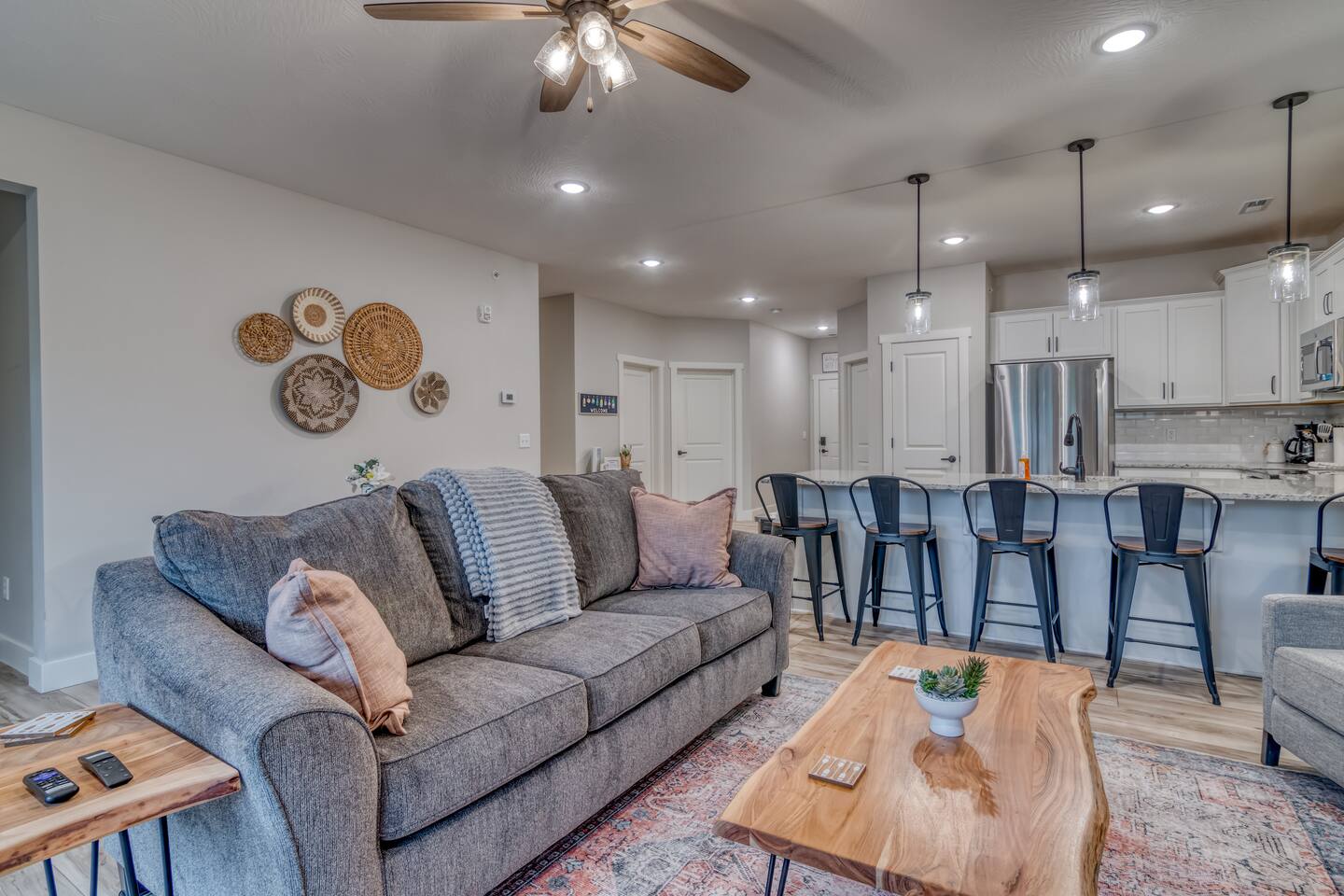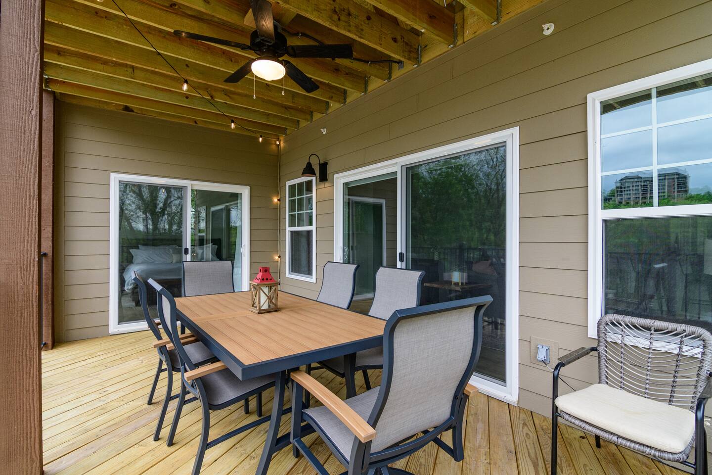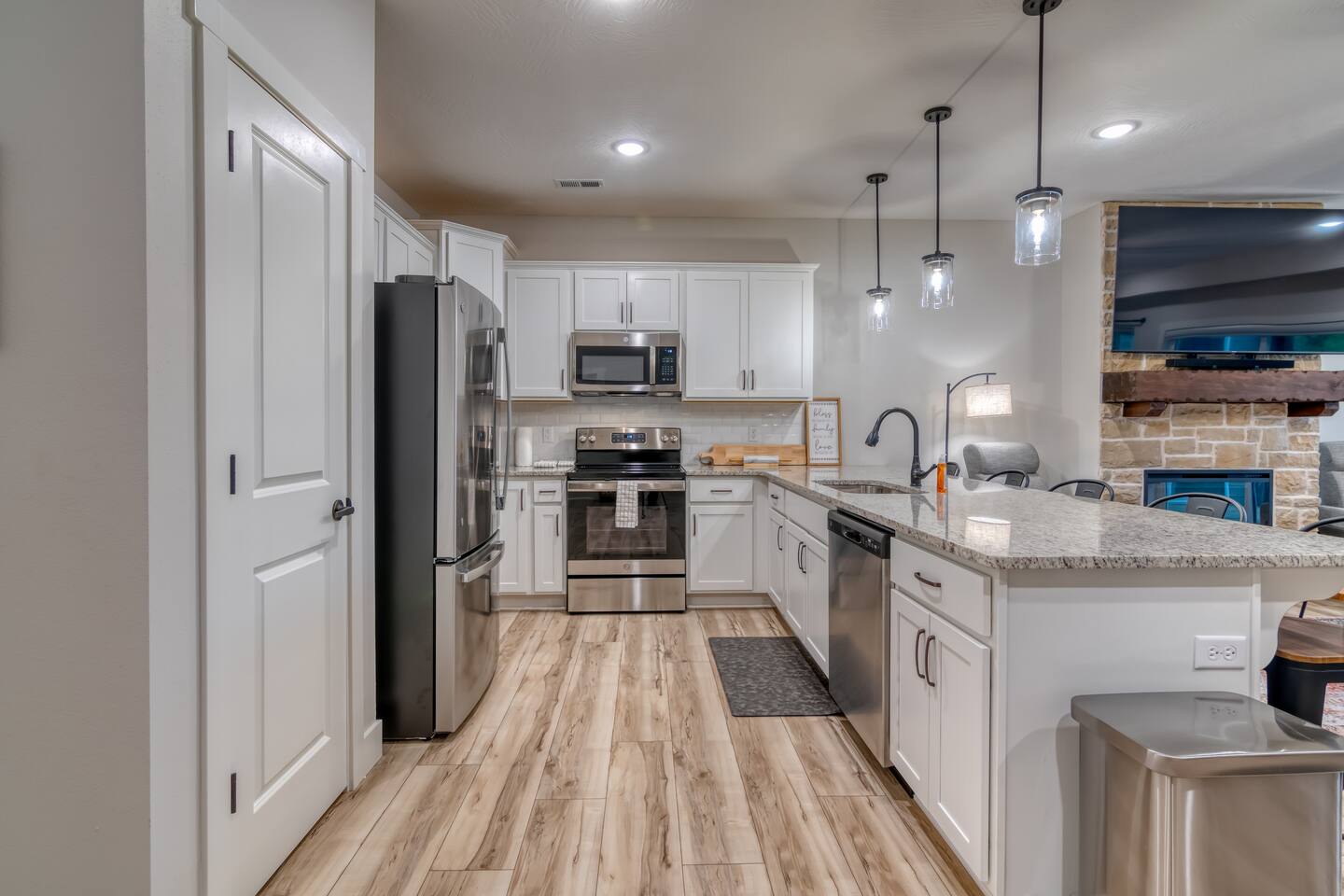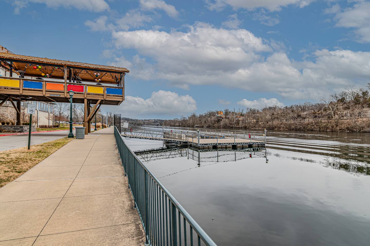 Welcome to our BRAND NEW charming waterfront condo, located on the beautiful Lake Taneycomo, just a short drive away from the Branson Landing. Our 3-bedroom, 2-bathroom condo is the perfect retreat for families, couples, or groups of friends looking for a serene getaway. As you step inside, you'll be greeted by a spacious living area that boasts large windows and abundant natural light, offering breathtaking views of the lake. The open layout seamlessly connects the living room to the dining area and kitchen, making it perfect for entertaining guests or spending quality time with family. There's also a large flat screen TV in the living room for your entertainment. Our fully equipped kitchen features modern appliances, granite countertops, and everything you need to prepare delicious meals. The dining area has a six-person table and chairs, perfect for enjoying a meal with loved ones. Or you can step outside and take dinner to the deck, where you can relax, unwind, and watch the stunning sunsets over the lake. Each of our three elegantly appointed bedrooms includes a comfortable king bed, ensuring a restful night's sleep. The bedrooms also feature flat screen TVs, perfect for relaxing after a long day of exploring the area. The two bathrooms have fresh towels ready for you to use during your stay. In addition to the stunning lake views, our condo complex offers a range of amenities, including a swimming pool (hot tub is currently under repair), fire pit, playground, and easy access to Lake Taneycomo. Whether you want to take a dip in the pool, fish from the bank, or rent a boat for some fun on LakeTaneycomo, there's something for everyone to enjoy. Our location is unbeatable - just minutes away from the Branson Landing, where you can enjoy world-class entertainment, shopping, and dining experiences. We are also conveniently located near Kanakuk, making our condo the perfect spot for families whose children are attending the nearby camp. Book now and experience the ultimate vacation at our cozy waterfront condo on Lake Taneycomo!